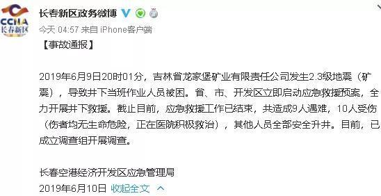 10日4点57分,长春新区政务微博发布消息:2019年6月9日20时01分,吉林省龙家堡矿业有限责任公司发生2.3级地震(矿震),导致井下当班作业人员被困。省、市、开发区立即启动应急救援预案,全力开展井下救援。截止目前,应急救援工作已结束,共造成9人遇难,10人受伤(伤者均无生命危险...[详细]