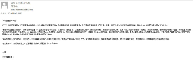 今天,董事会批准了我申请辞去360金融CEO和执行董事的议案。
